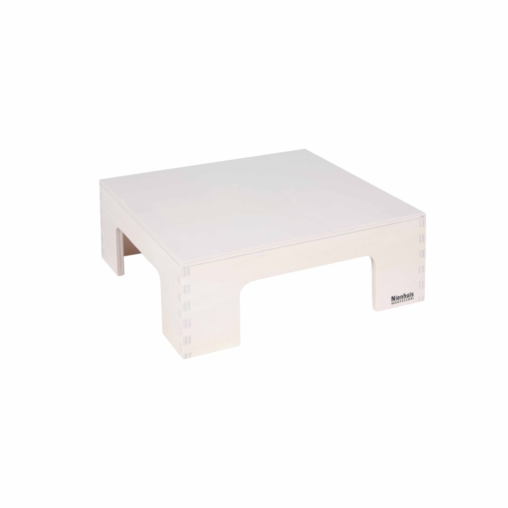 Podstavec je vyroben z březové překližky a má světlou povrchovou úpravu s bílou lazurou, která ladí s celkovou čistotou a jednoduchostí Montessori materiálů. Díky své velikosti a proporcím přesně odpovídá základně růžové věže a zajišťuje její stabilitu i při samostatné manipulaci dětí.