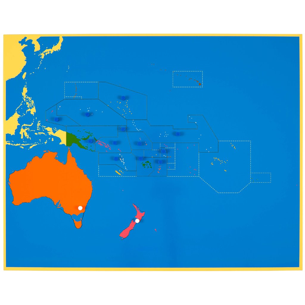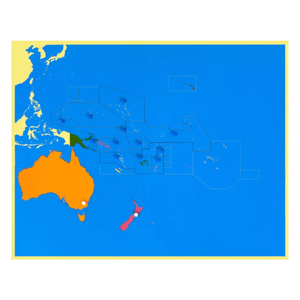 Prostřednictvím smyslových aktivit s puzzle AUSTRÁLIE a OCEÁNIE si děti začínají budovat znalosti světové geografie. Sítotiskové mapy jsou vyřezávány laserem, díky čemu je zajištěna přesnost a dostupnost náhradních dílů.