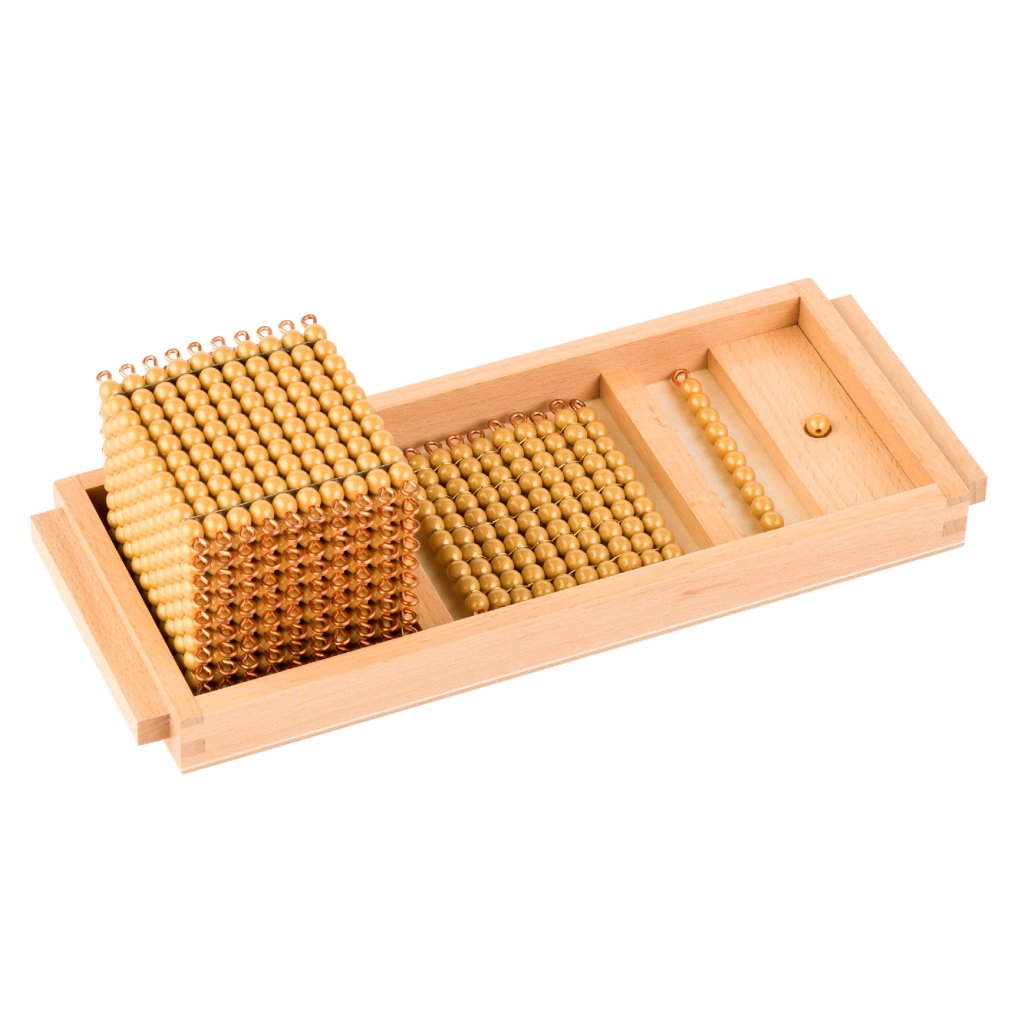 Dřevěný podnos obsahuje krychli o 1000 perlách, destičku o 100 perlách, tyčinku z 10 perel a jednotku reprezentovanou jednou perlou. Děti tak mají možnost konkrétně vidět a cítit, jak se jednotlivé řády od sebe liší.