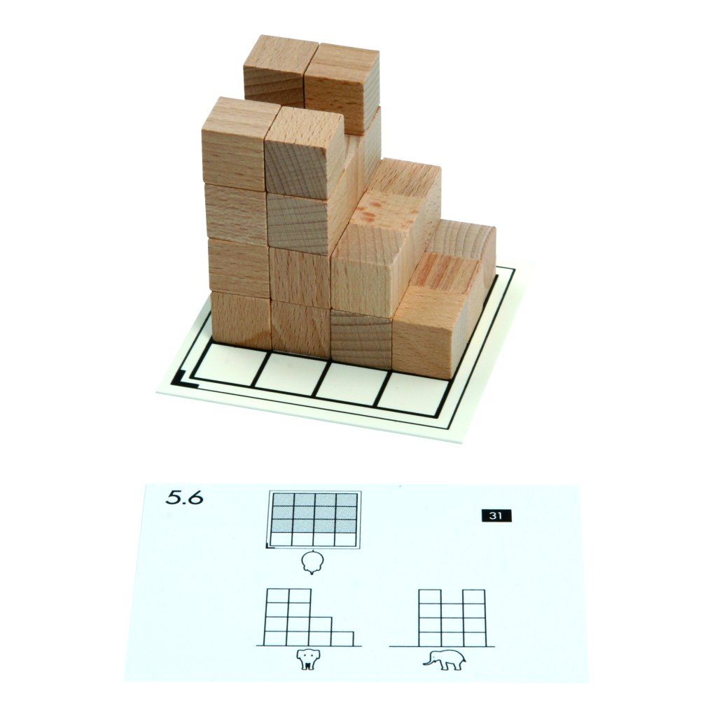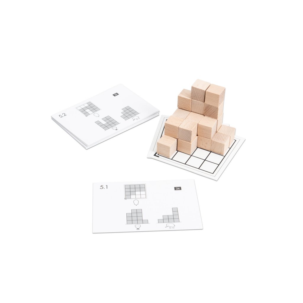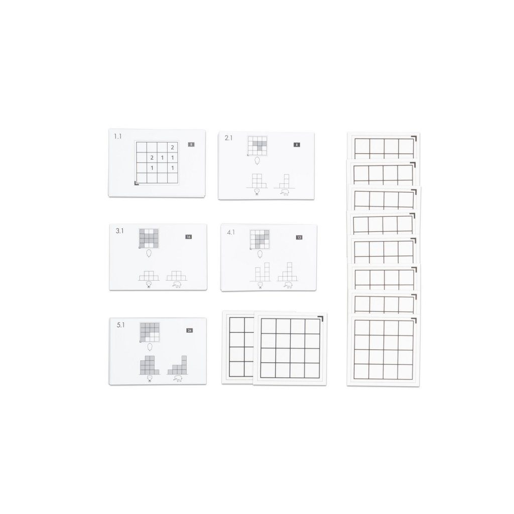 - 10 pracovních karet (13 x 9 cm) k práci s dřevěnými krychlovými kostkami.