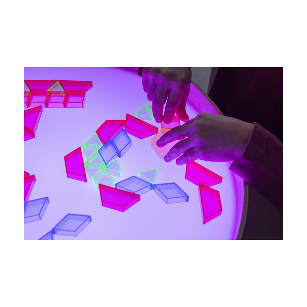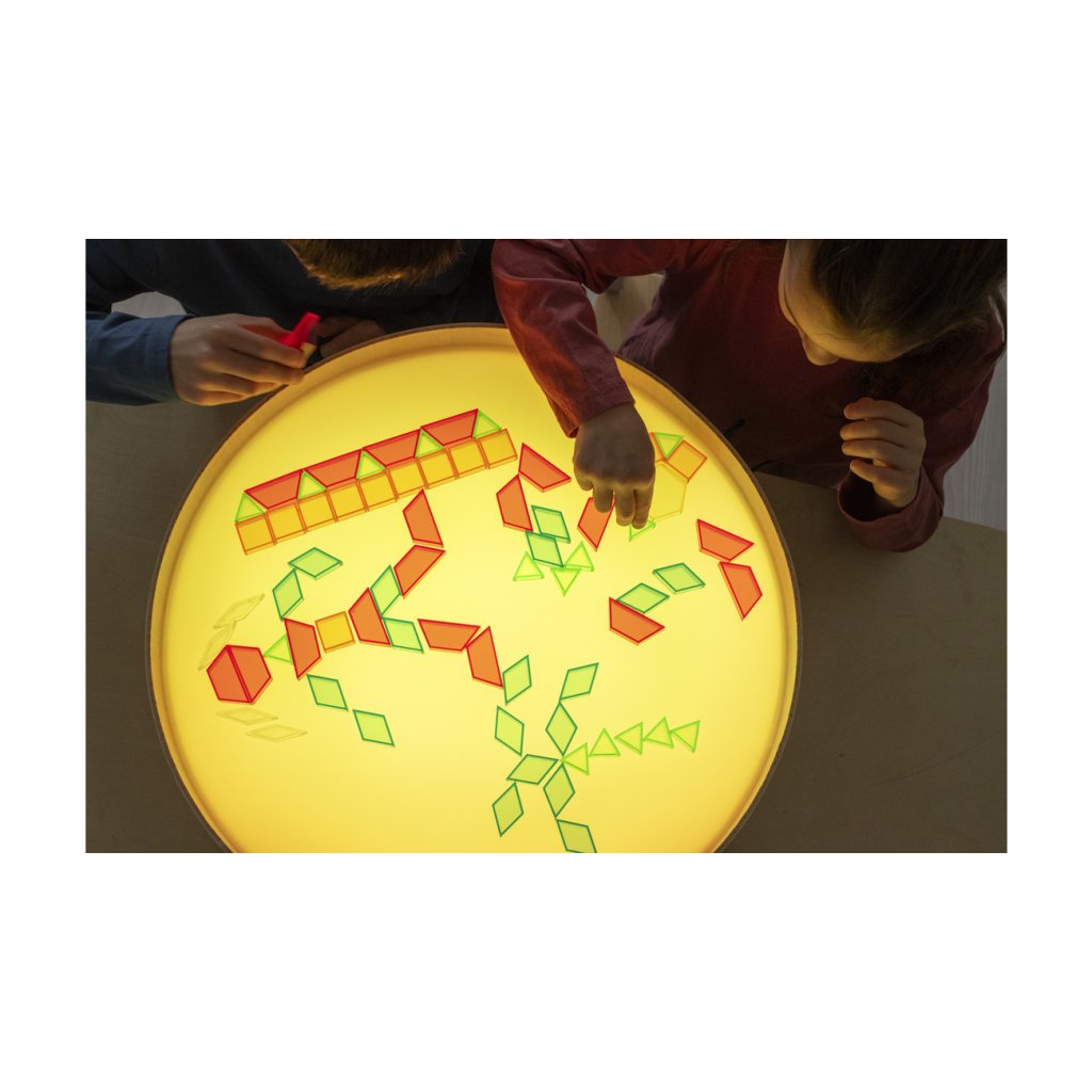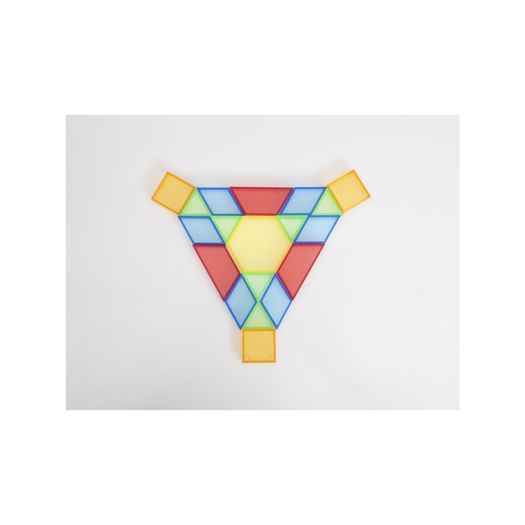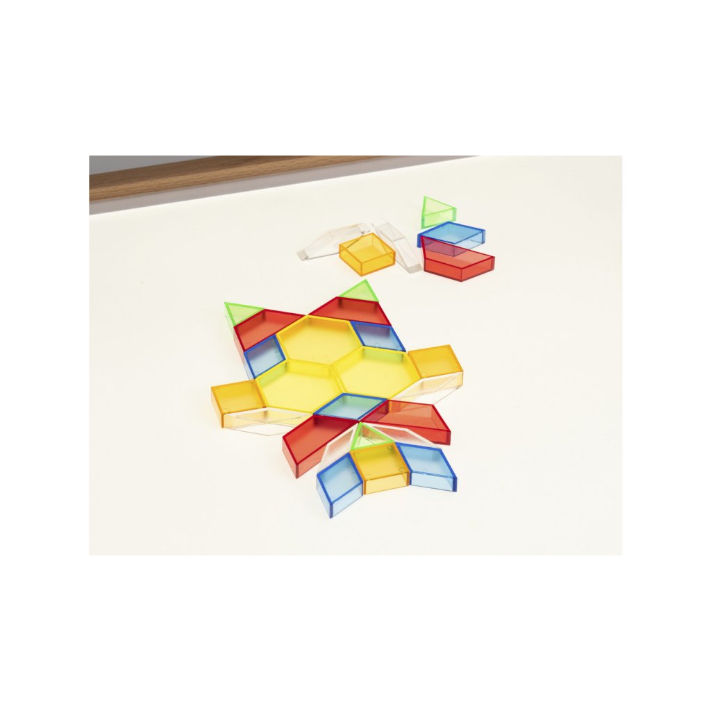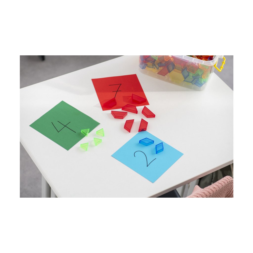 Průhledná tělesa tvary - 360 kusů v krabici 6 tvarů v 6 barvách po 10 kusech pro první matematická cvičení vhodné pro děti od 4 let 360 dílů pro rozsáhlé herní možnosti Tělesa průhledných tvarů se skládají ze 6 různých geometrických tvarů v 6 barvách. Celkem 360 dílů je dodáváno v praktickém boxu a jsou tedy vždy po ruce. Průhledný, robustní plast je ideální pro uchopení a je vhodný i pro magické prosvětlovací stoly. Díky jednotným úhlům a stranám do sebe destičky těles dokonale zapadají. První geometrické tvary jsou hravě položeny a jsou také realizovány, vhodné i pro třídící hry. Zahrnuty jsou žluté šestiúhelníky, zelené trojúhelníky, modré diamanty, oranžové čtverce, červené lichoběžníky a bezbarvé diamanty. Možnosti her: Rozpoznání barev a tvarů Pokládka a pojmenování geometrických vzorů Rozvoj jemné motorikyDoplňkové parametry