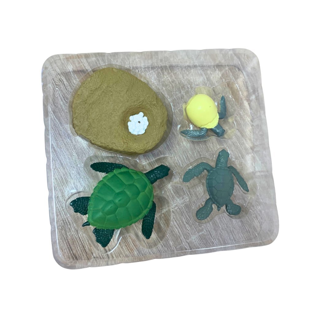 Figurky životního cyklu mořské želvy zobrazují jednotlivé fáze vývoje – vajíčka v písku, líhnutí mláděte, mladou želvu a dospělou želvu. Díky ručnímu malování a realistickému zpracování mohou děti detailně pozorovat změny tvaru i velikosti během růstu. Figurky jsou ideální pro výuku, tematické koutky i samostatnou hru.