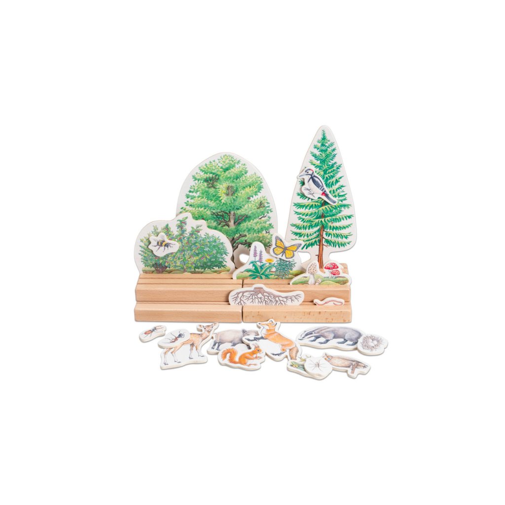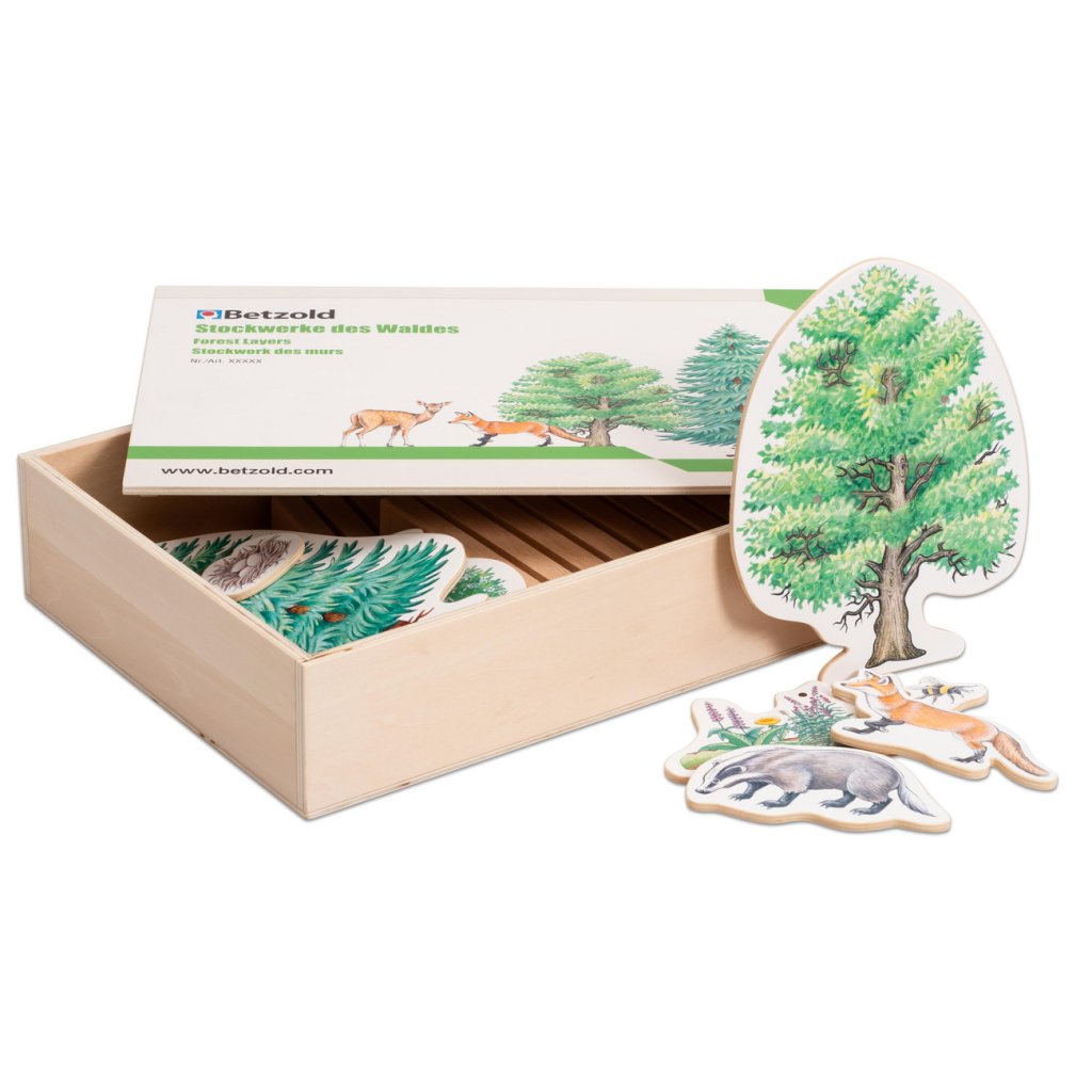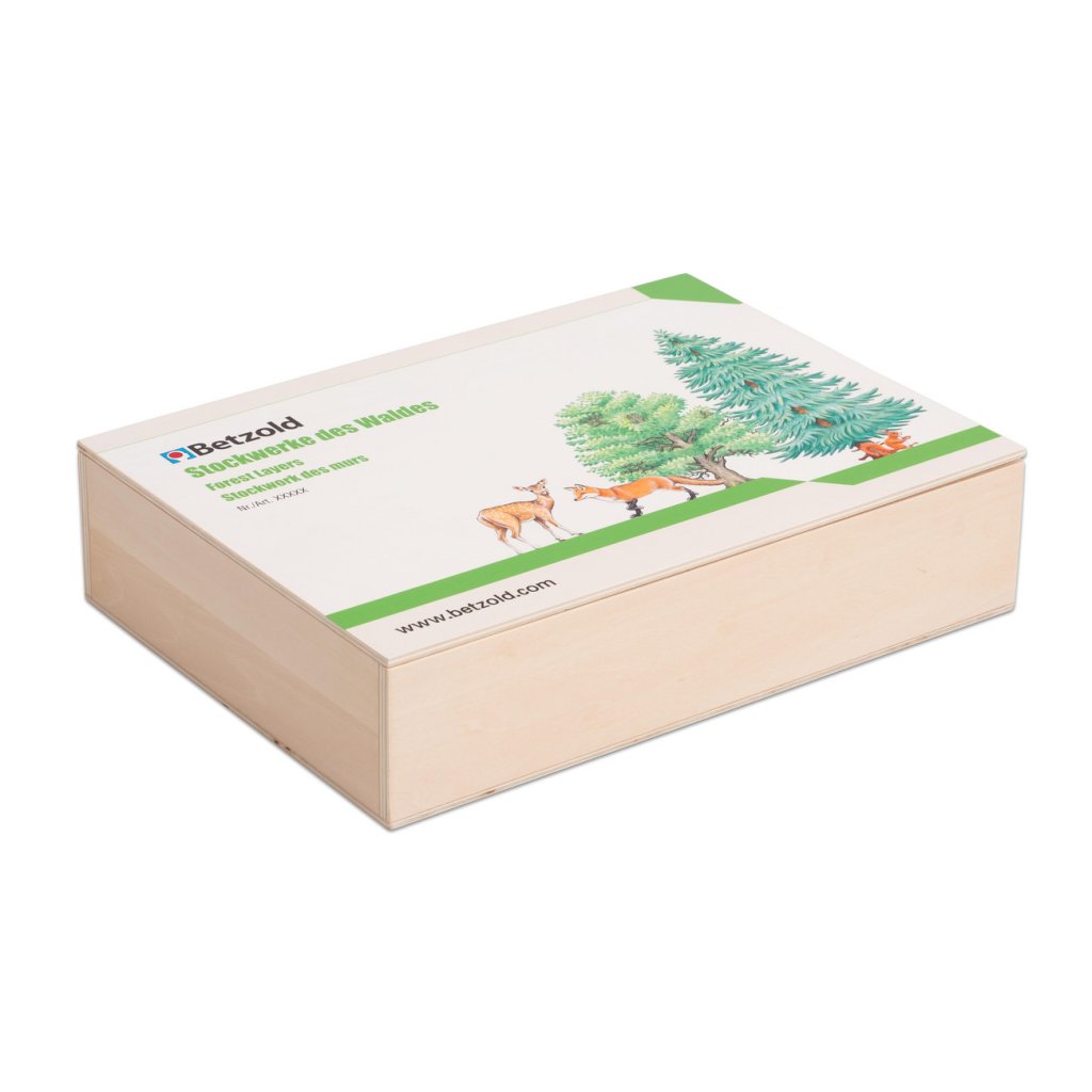 Rozsah dodávky Sada obsahuje 25 dřevěných dílů. - 15 zvířat (liška, srnčí zvěř, jezevec, divočák, datel, pavouk, ptačí hnízdo, mravenec, ropucha, veverka, žížala, sova, včela, motýl, sova) - 6 obrázků lesního patra: 1ks listnatý strom 1ks jehličnan pro stromové patro 1ks keř pro keřové patro 2ks bylinné patro a mechové patro 1ks kořen pro kořenové patro 4 dřevěné držáky (2ks s 5 drážkami a 2ks se 6 drážkami) papírová kopírovácí šablona Výuková hra pro děti, která ukazuje vrstvy lesa. Dřevěná krabice s víkem (V x Š x H: 7.5 x 32 x 23 cm). Stromy a malá zvířata obsahují magnety, kdy například datla, motýla, veverku je možno umístit na maketu stromu, nebo keře. Každý keř a strom obsahuje 2ks magnetů pro umístění zvířat. Varování Upozornění: Vzdělávací materiál - má být používán pod přímým dohledem dospělé osoby.