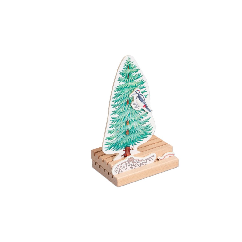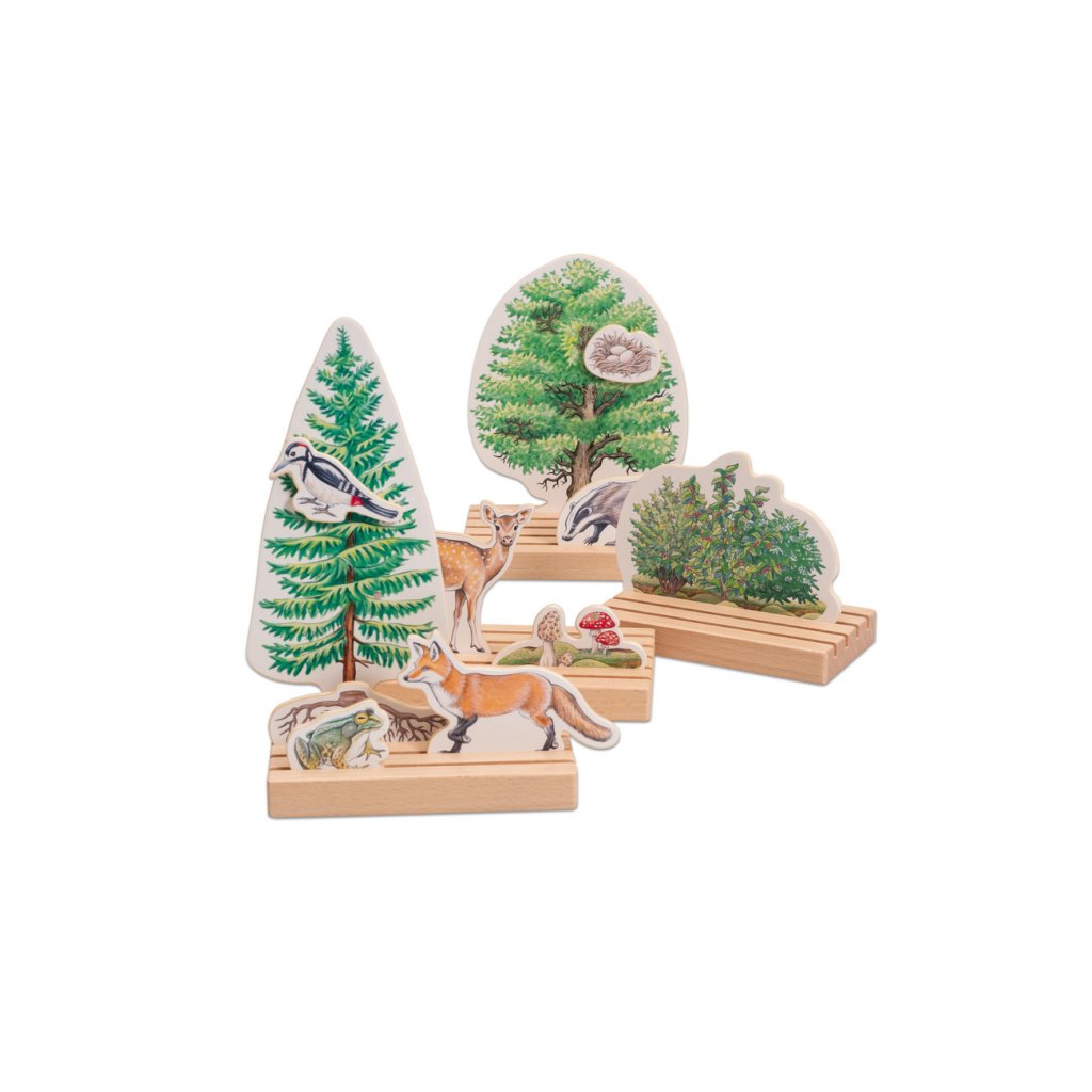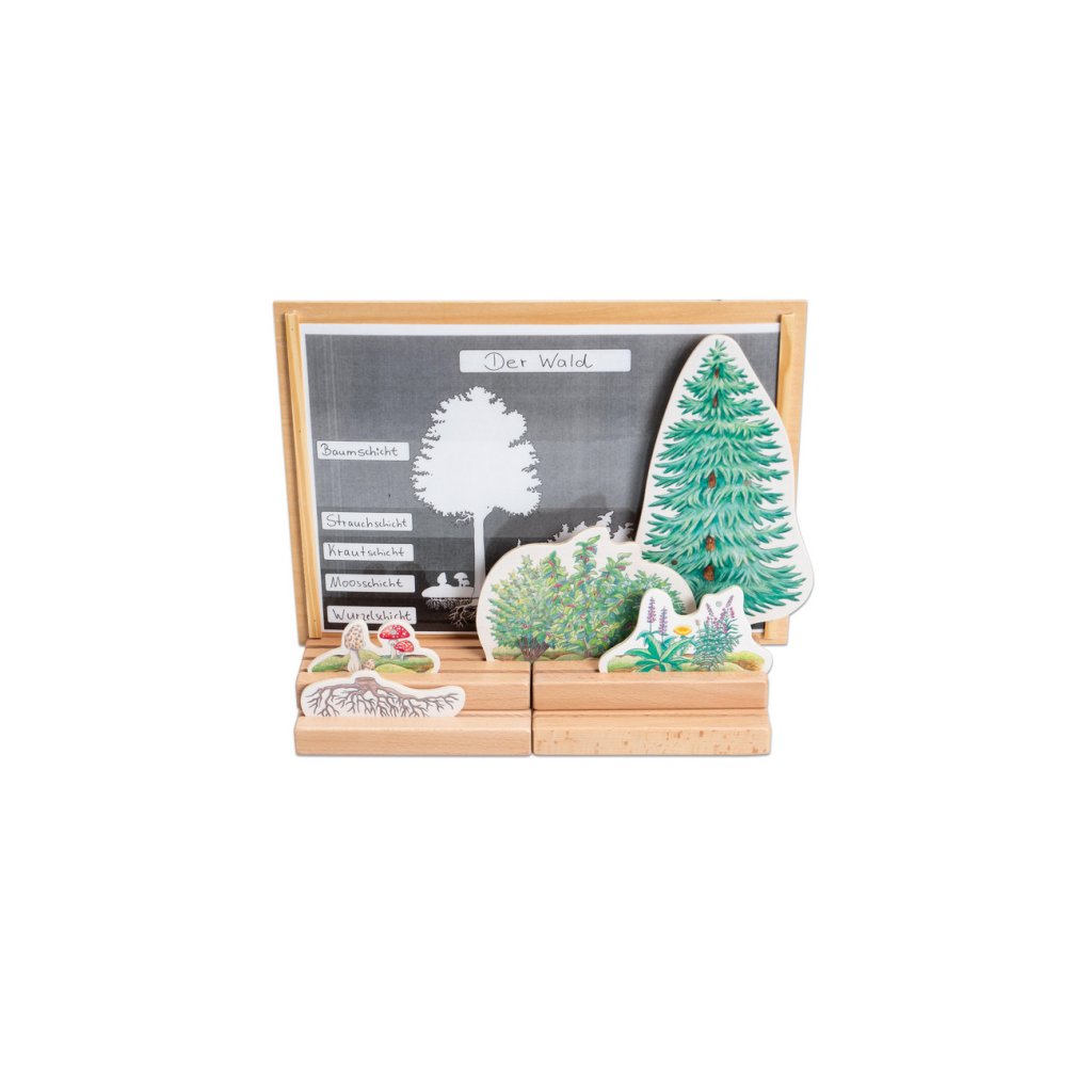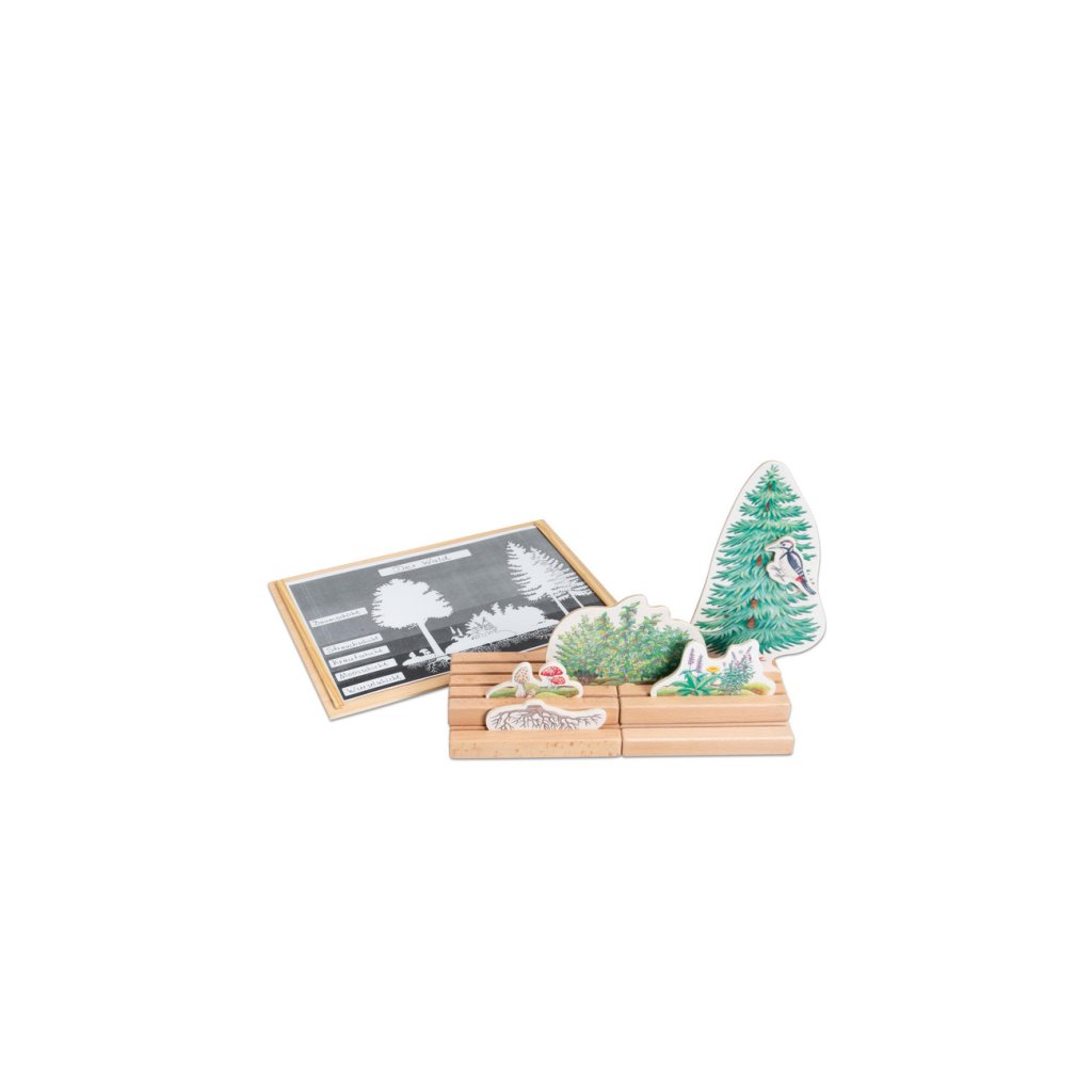 Rozsah dodávky Sada obsahuje 25 dřevěných dílů. - 15 zvířat (liška, srnčí zvěř, jezevec, divočák, datel, pavouk, ptačí hnízdo, mravenec, ropucha, veverka, žížala, sova, včela, motýl, sova) - 6 obrázků lesního patra: 1ks listnatý strom 1ks jehličnan pro stromové patro 1ks keř pro keřové patro 2ks bylinné patro a mechové patro 1ks kořen pro kořenové patro 4 dřevěné držáky (2ks s 5 drážkami a 2ks se 6 drážkami) papírová kopírovácí šablona Výuková hra pro děti, která ukazuje vrstvy lesa. Dřevěná krabice s víkem (V x Š x H: 7.5 x 32 x 23 cm). Stromy a malá zvířata obsahují magnety, kdy například datla, motýla, veverku je možno umístit na maketu stromu, nebo keře. Každý keř a strom obsahuje 2ks magnetů pro umístění zvířat. Varování Upozornění: Vzdělávací materiál - má být používán pod přímým dohledem dospělé osoby.
