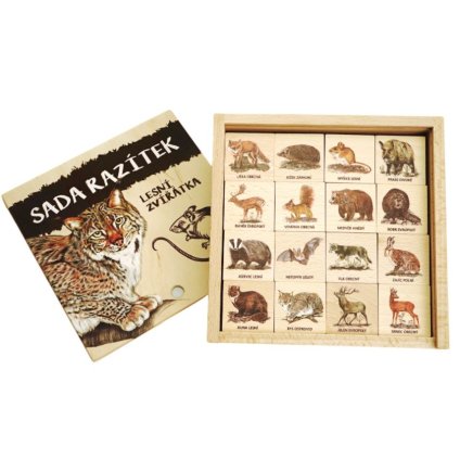 16 dřevěných razítek s motivy zvěře a jejich stop Velikost razítek: 4,5×4,5 cm – ideální pro dětskou ručku Přírodní dřevěná kostka s hladkým opracováním (certifikát PEFC)...